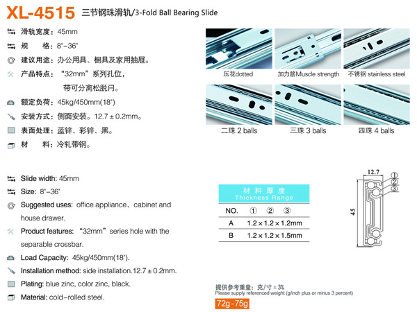 [Two sections and three sections of steel ball slides] XL-4512自鎖鋼珠滑軌