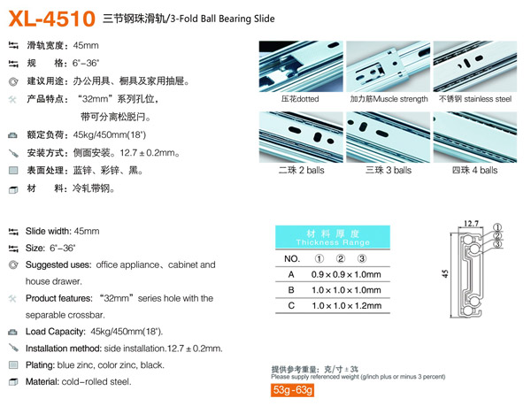 [Two sections and three sections of steel ball slides] XL-4515鋼珠滑軌